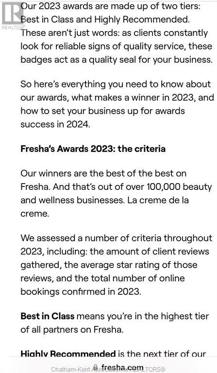 Have you ever wanted your very own Tanning/Beauty Salon Business?? Well here it is COMPLETELY TURN KEY. This business only Tanning/Beauty Salon is Completely Stocked with all Products for your Inventory. It also has all the Equipped you will ever need such as Tanning Beds, Chairs, Fixtures Beauty Stations, Office Equipment, Reception Furniture, Wall Art, I mean this Business is a one in a million opportunity. FRESHA AWARD WINNER NUMBER ONE IN 100,000 Rating in in North America. For details on Lease, Chattels and Inventory Call Listing Agent. Call for your private showing. Seller has the right to accept or decline any and all offers. Owner Retiring ""DO NOT MISS THIS AMAZING OPPORTUNITY"" (id:4069)